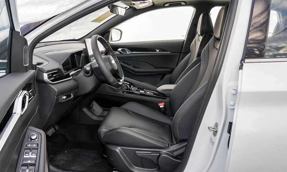 Отделка интерьера и сидений экокожей чёрного цвета с контрастной строчкой красного цвета